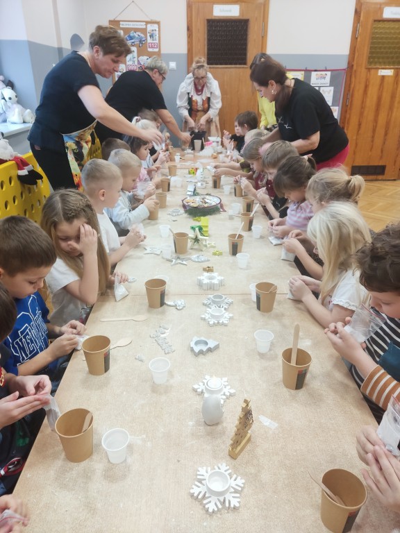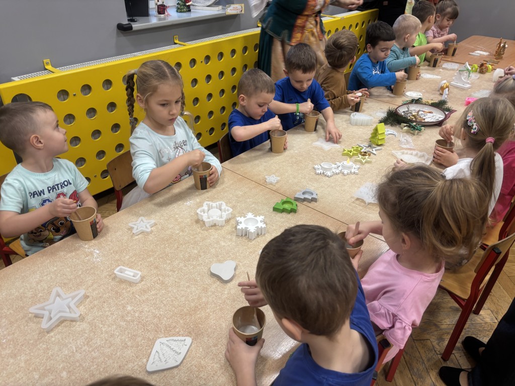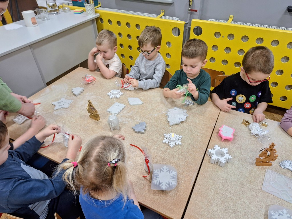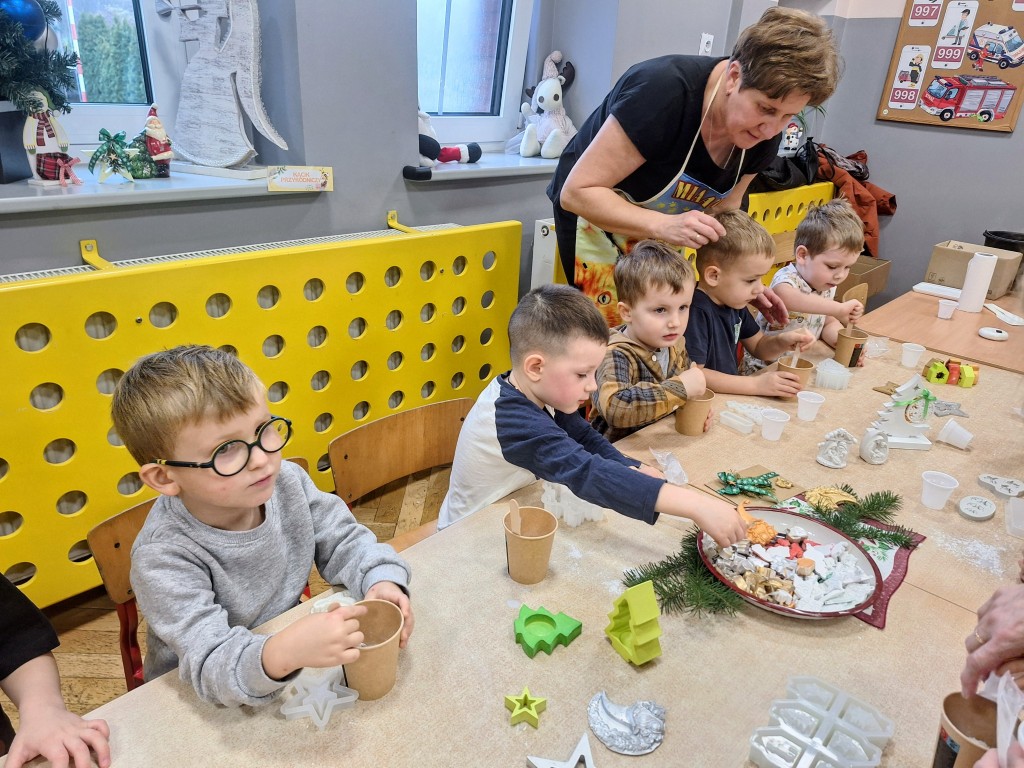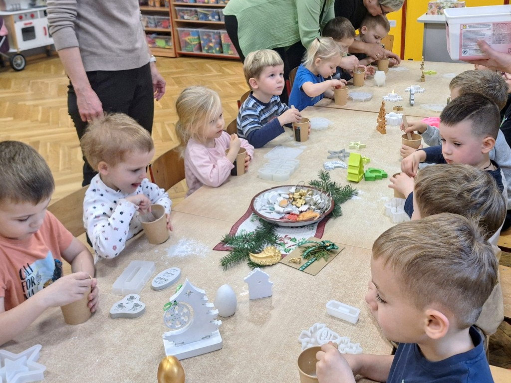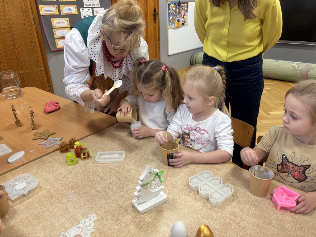 W naszym przedszkolu odbyły się wyjątkowe warsztaty świąteczne, które poprowadziły panie z naszego Koła Gospodyń. Dzieci miały okazję poznać tajniki odlewania gipsowych ozdób, a także samodzielnie wykonać świąteczną dekorację.