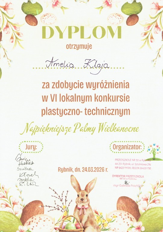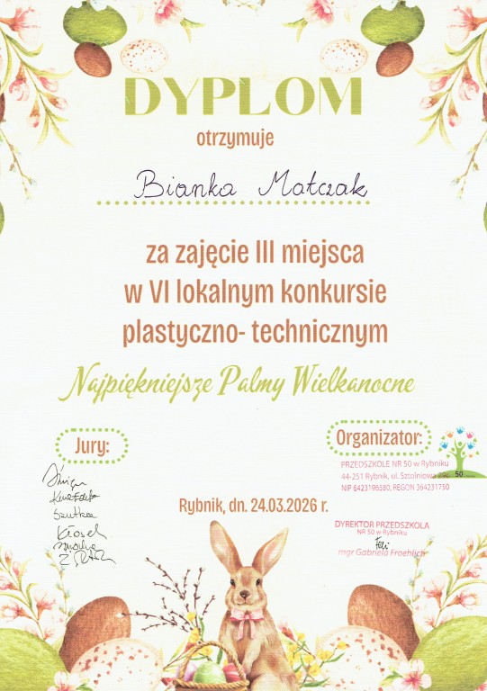 Z ogromną radością ogłaszamy, iż Bianka Matczak zdobyła III miejsce, a Amelia Klaja zdobyła wyróżnienie w VI lokalnym konkursie plastyczno-technicznym organizowanym przez Przedszkole nr 50 w Rybniku.