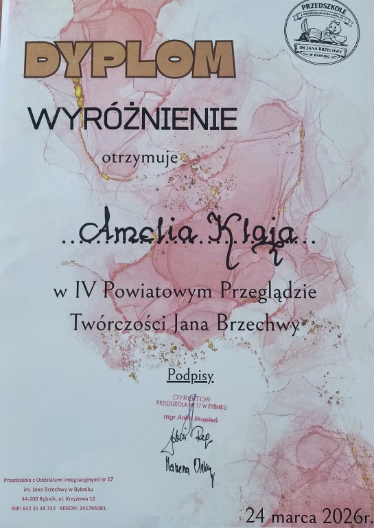 Z radością informujemy, iż Amelka Klaja z naszego przedszkola zdobyła wyróżnienie w IV Powiatowym Przeglądzie
