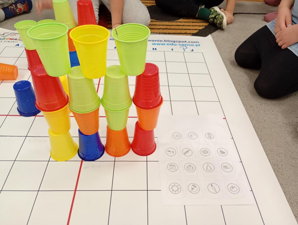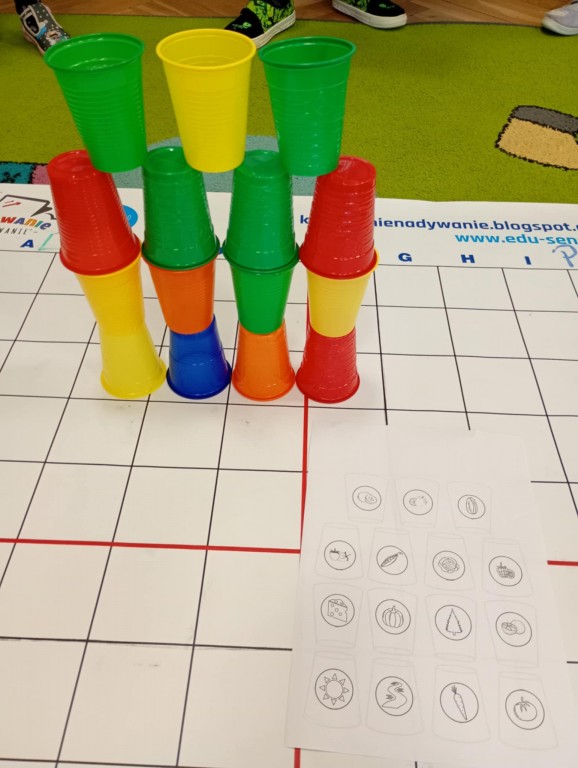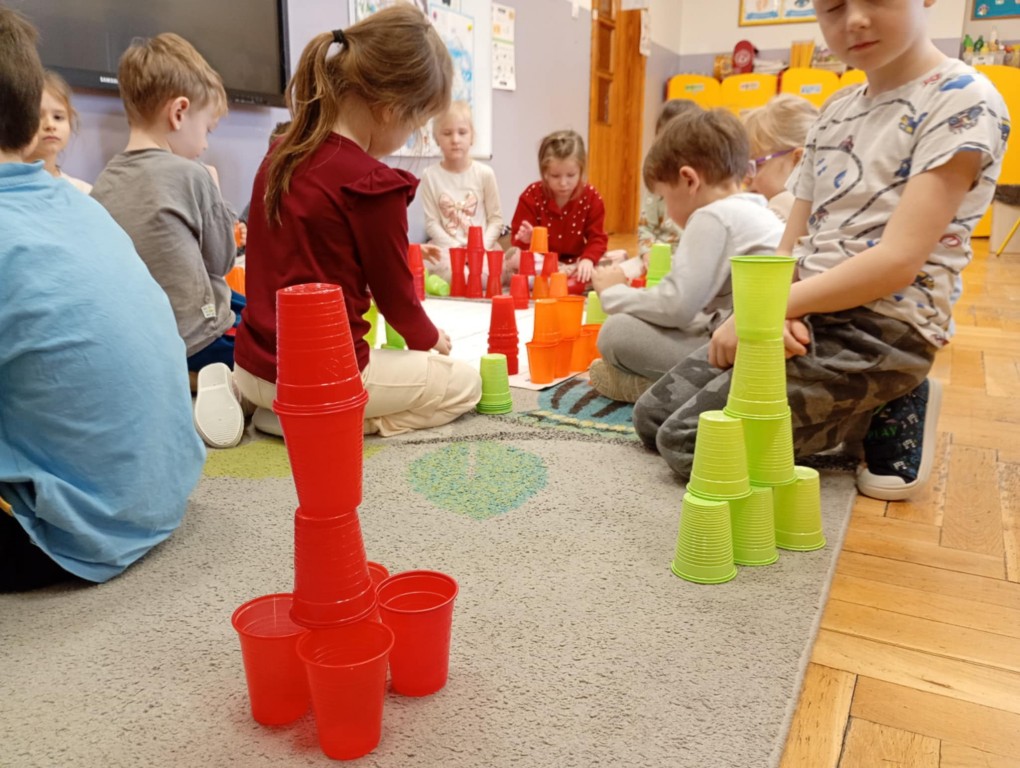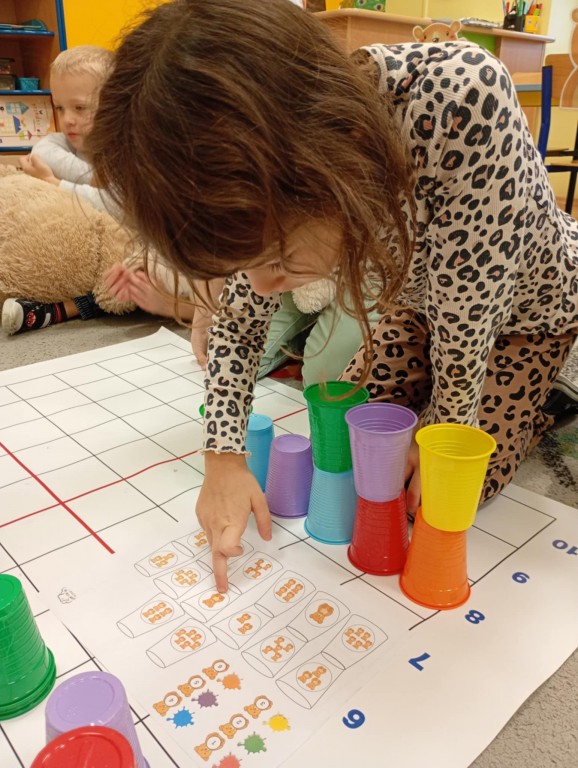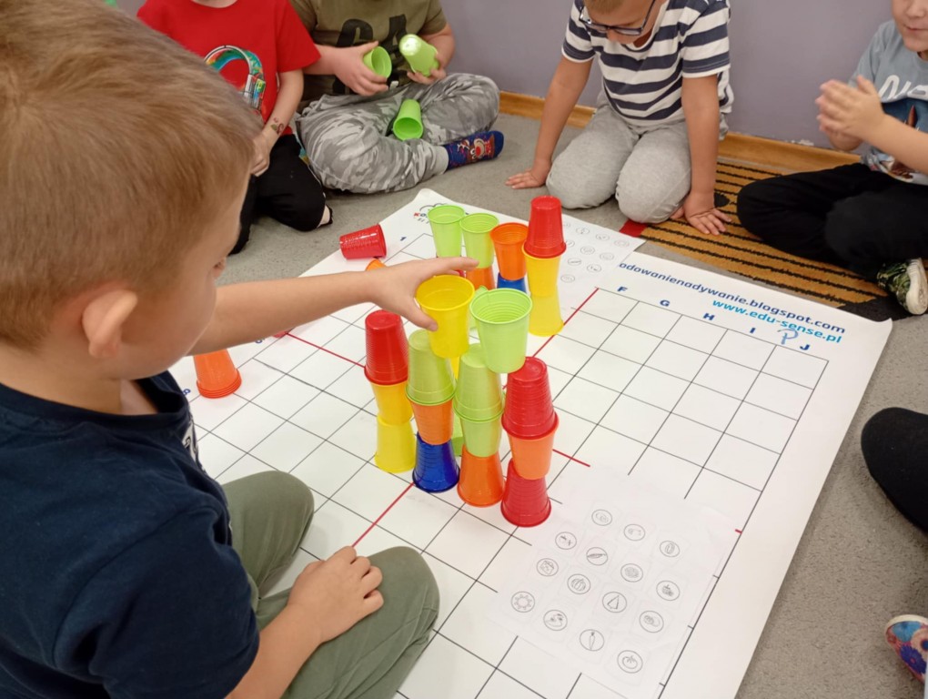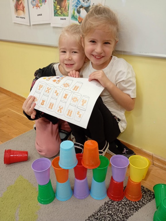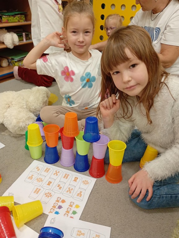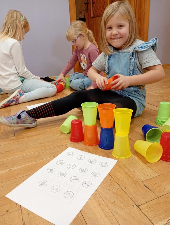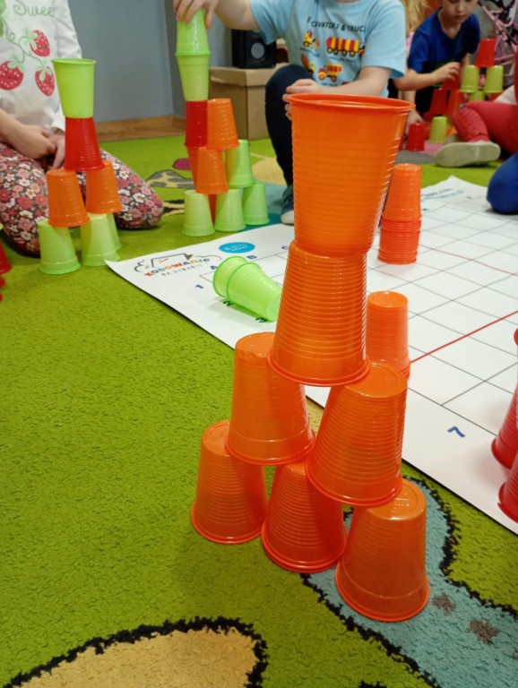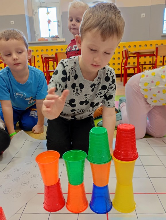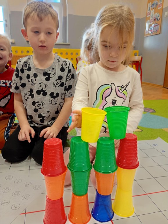 Podczas zajęć dzieci wykonały dyktando graficzne oraz ułożyły zakodowaną wieżę z kubków.