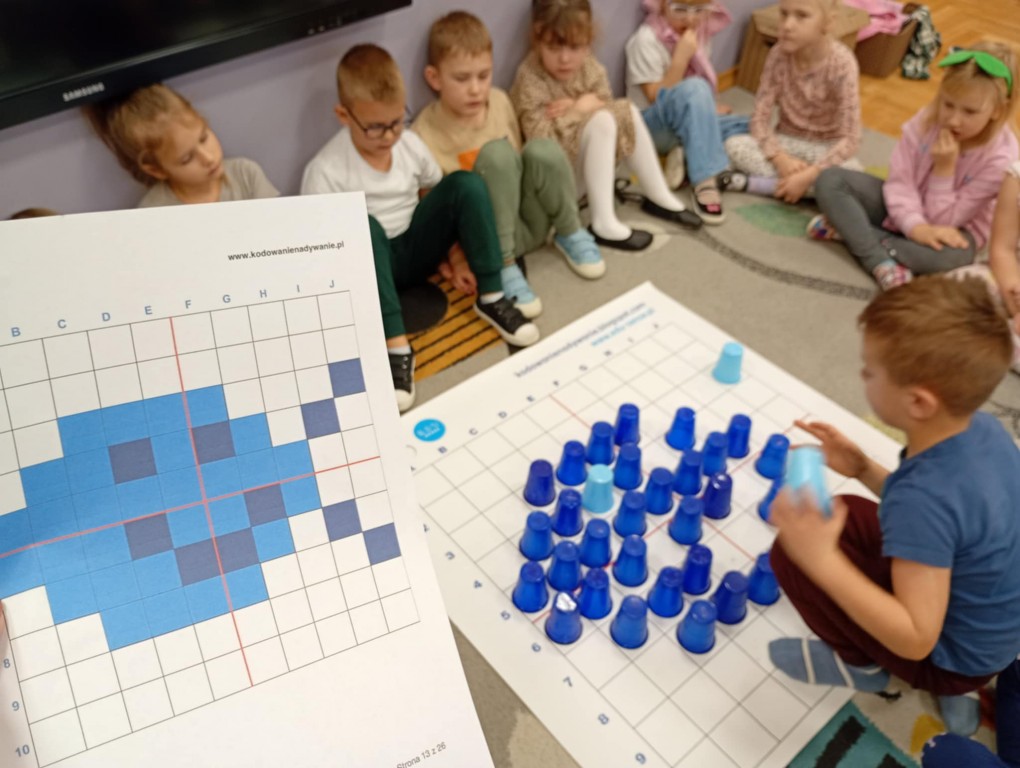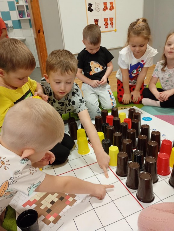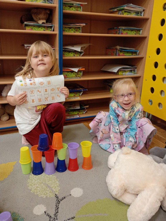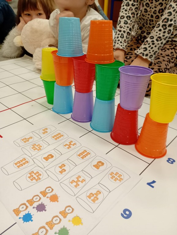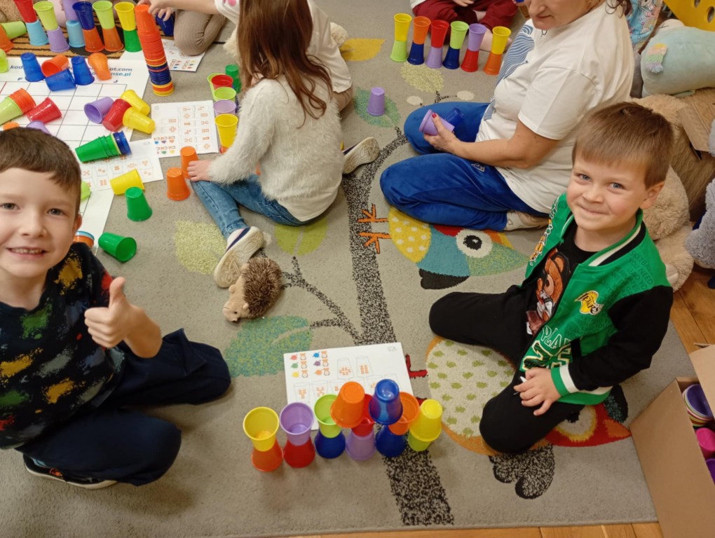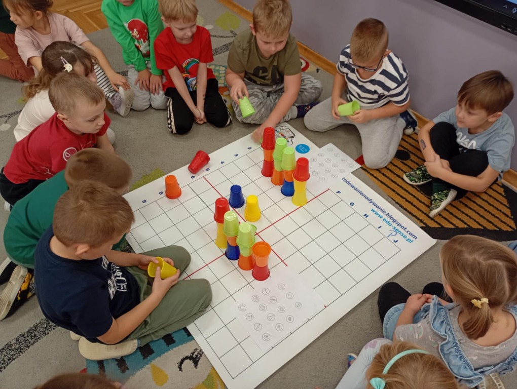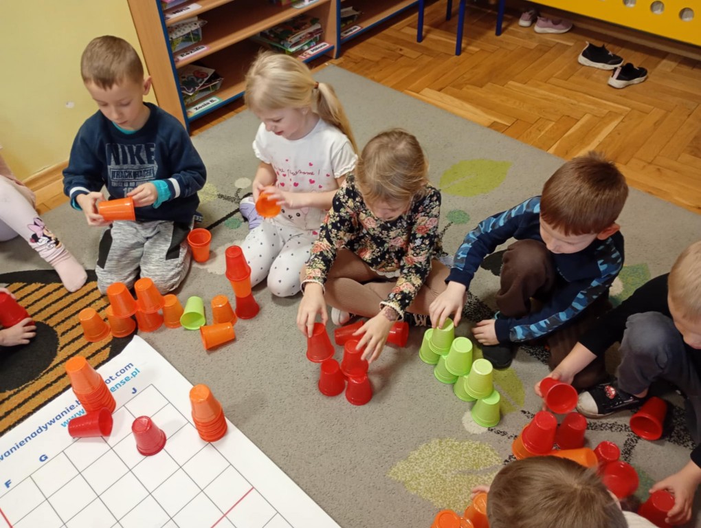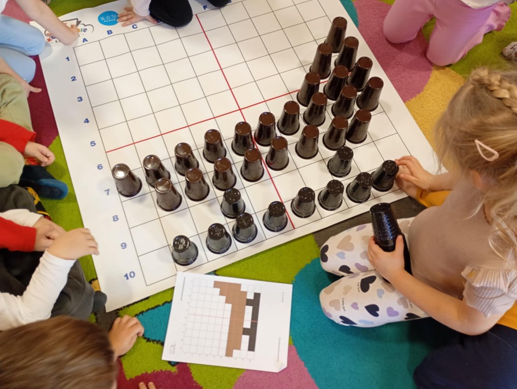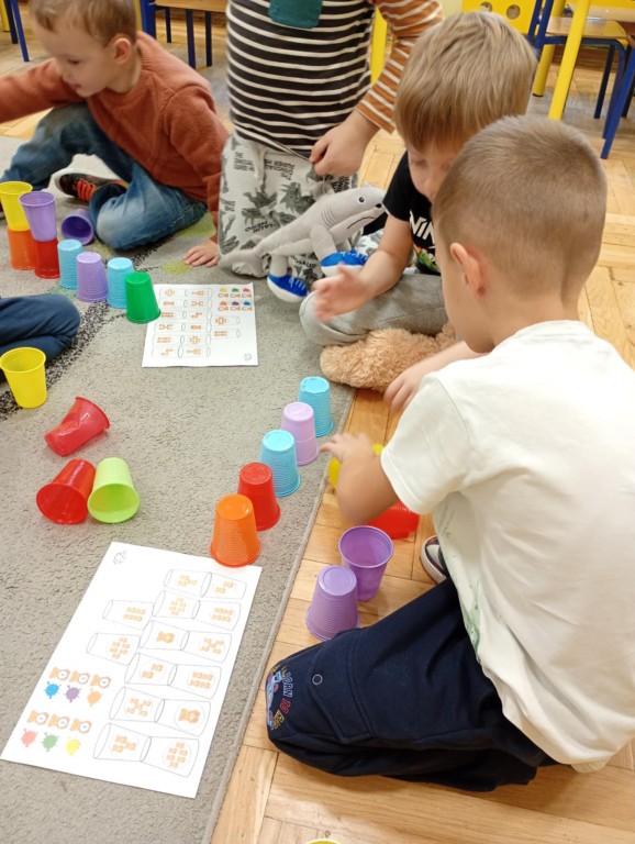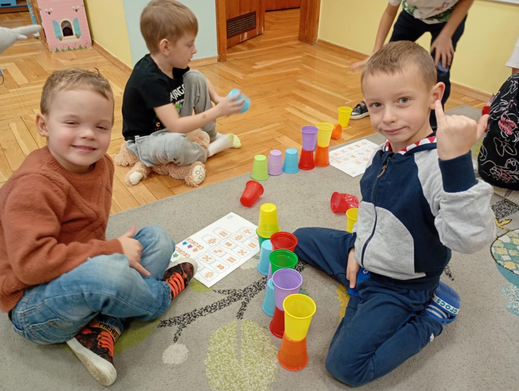 Podczas zajęć dzieci wykonały dyktando graficzne oraz ułożyły zakodowaną wieżę z kubków.