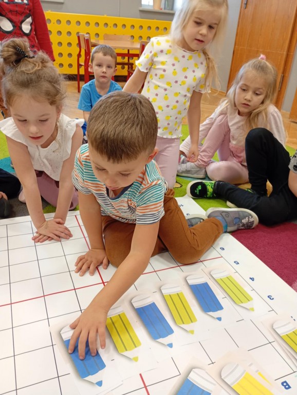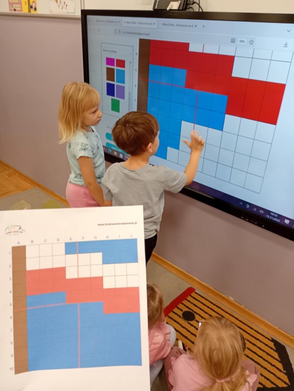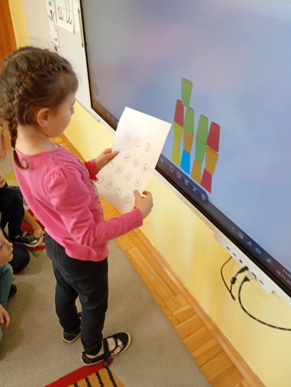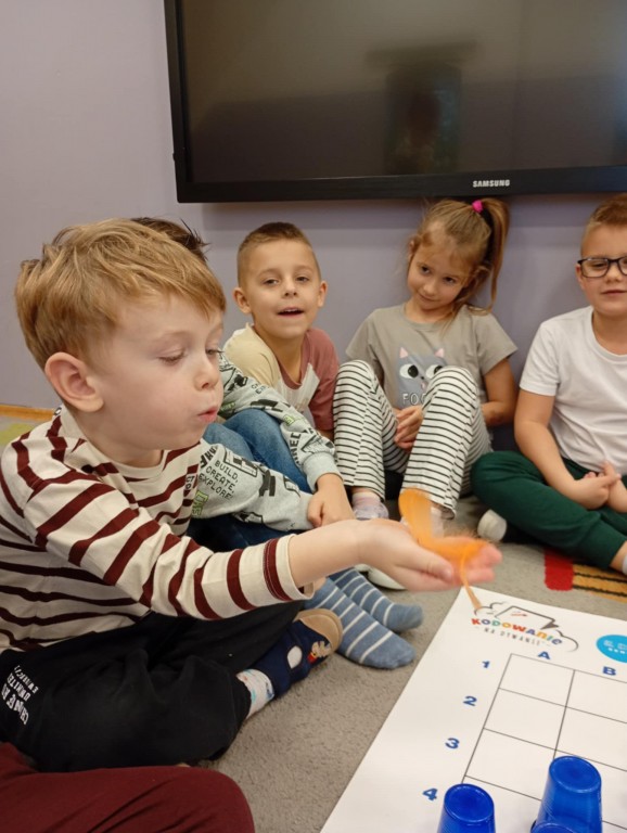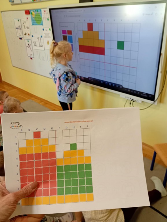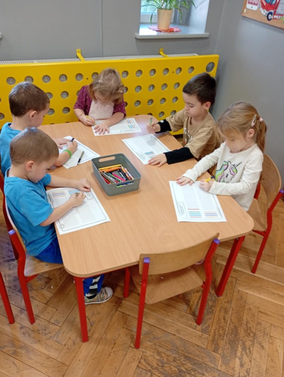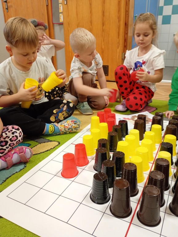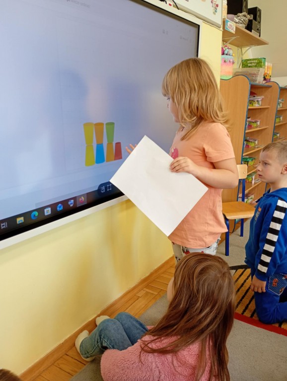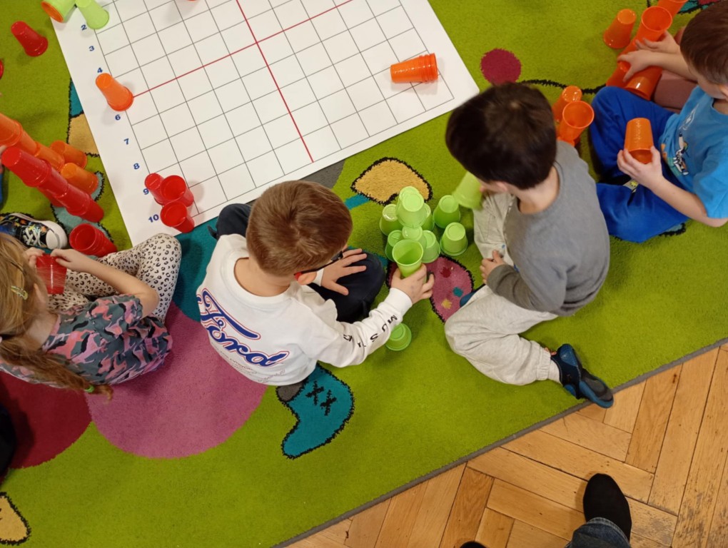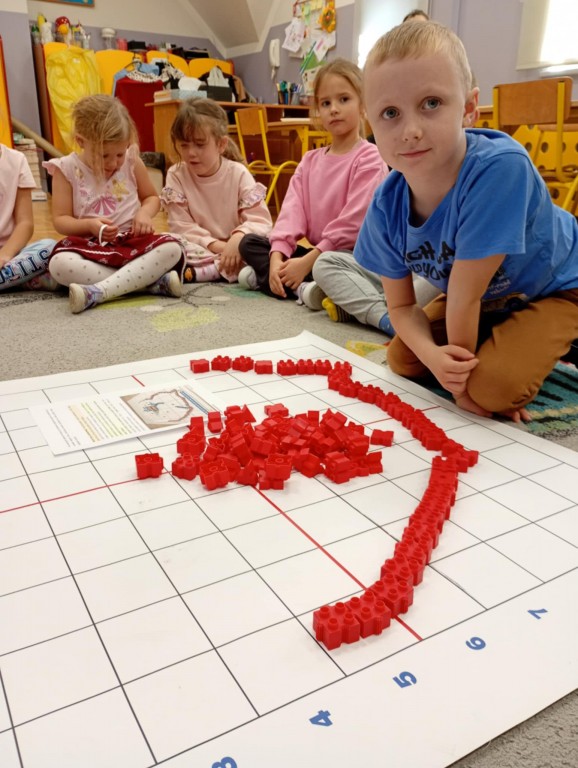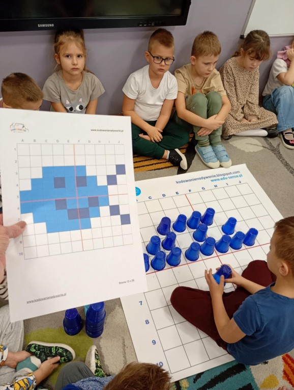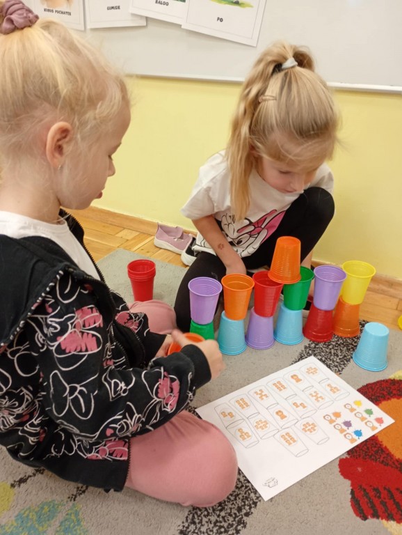 Podczas zajęć dzieci wykonały dyktando graficzne oraz ułożyły zakodowaną wieżę z kubków.