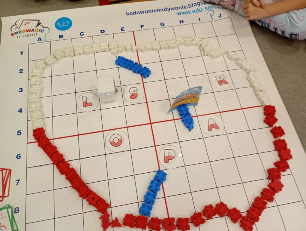 matę do kodowania, kolorowe klocki konstrukcyjne, kartki papieru, materiał naturalny lub