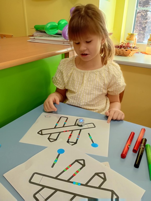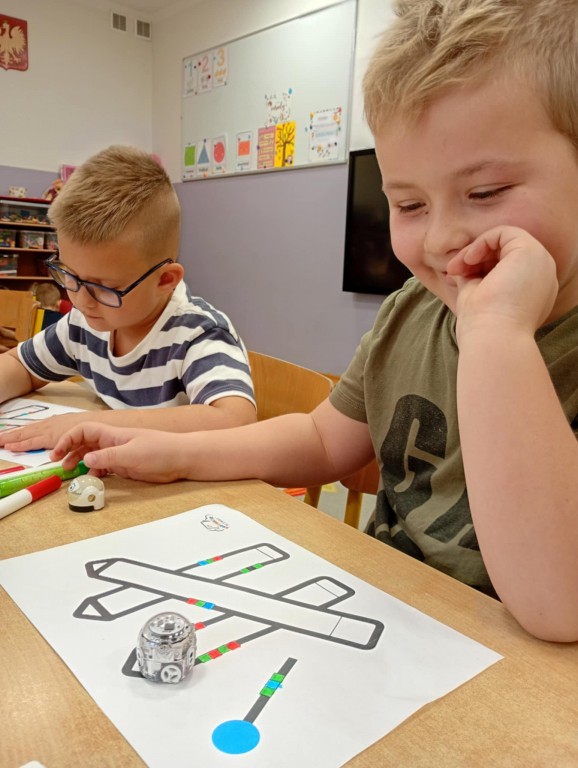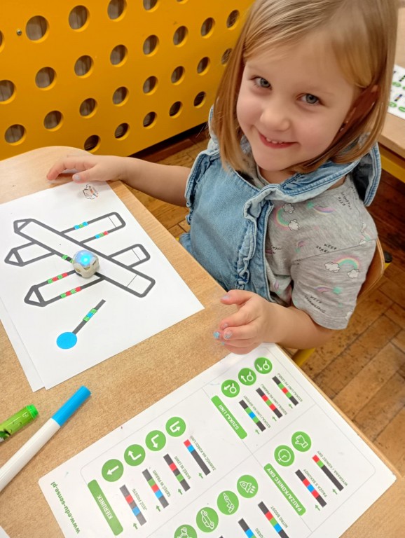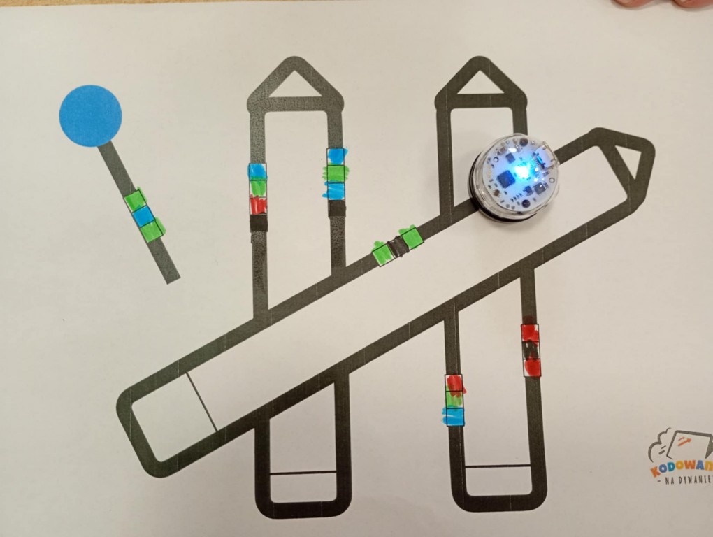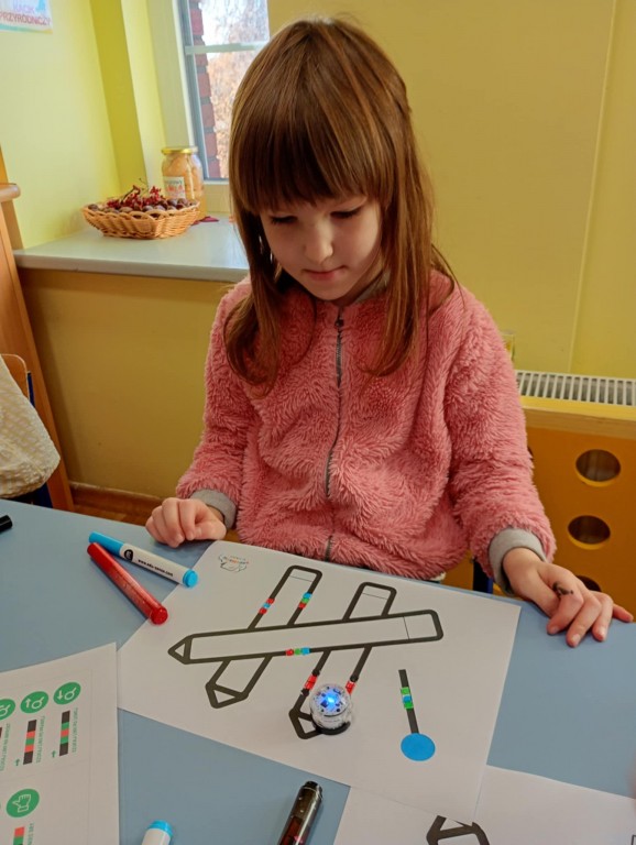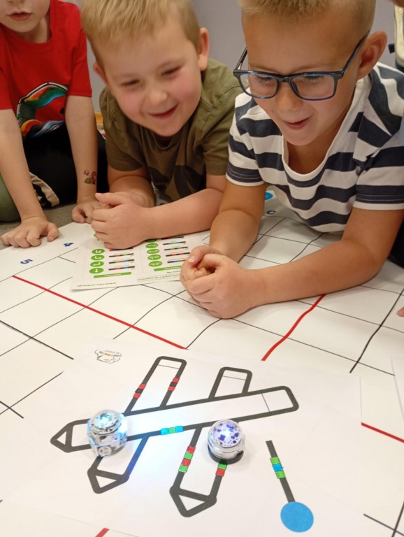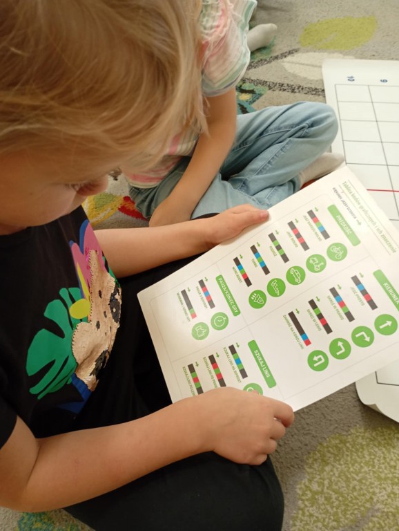 Zajęcia, które obejmują robotykę, nie mogłoby się odbyć bez programowania robotów. Dzieci wstawiały odpowiednie kody według tabeli kodów, aby Ozobot przejechał na kredki i poruszał się nieustatnie.