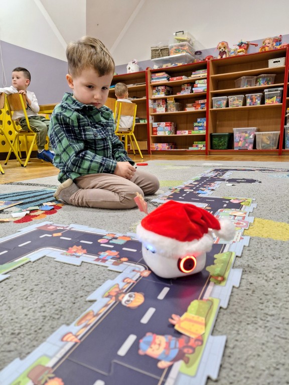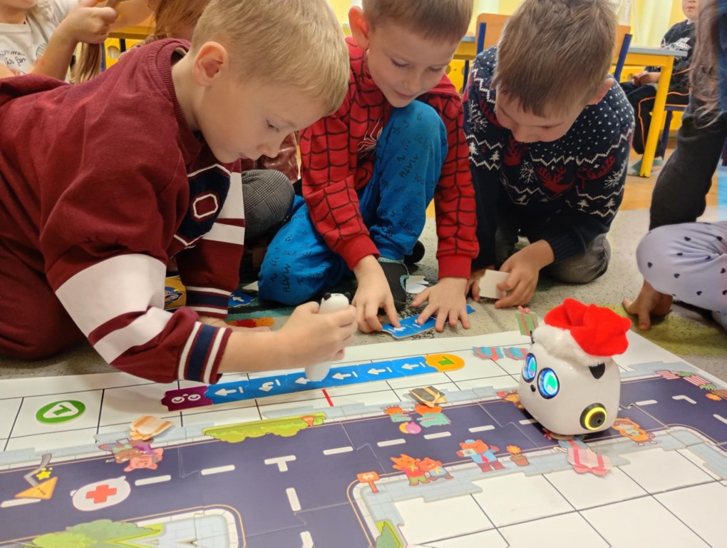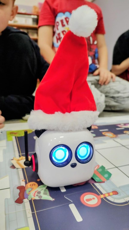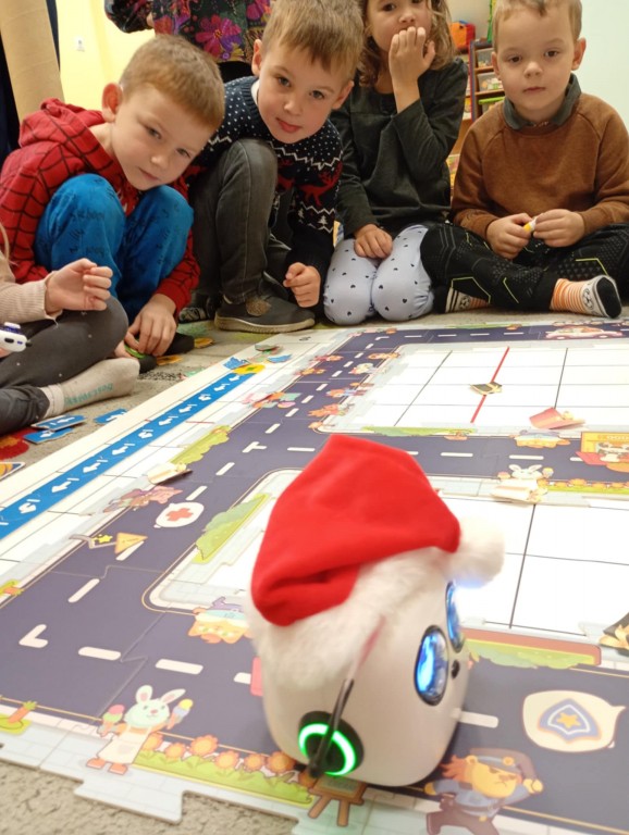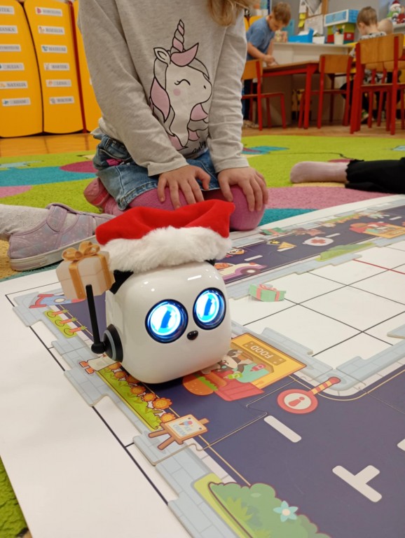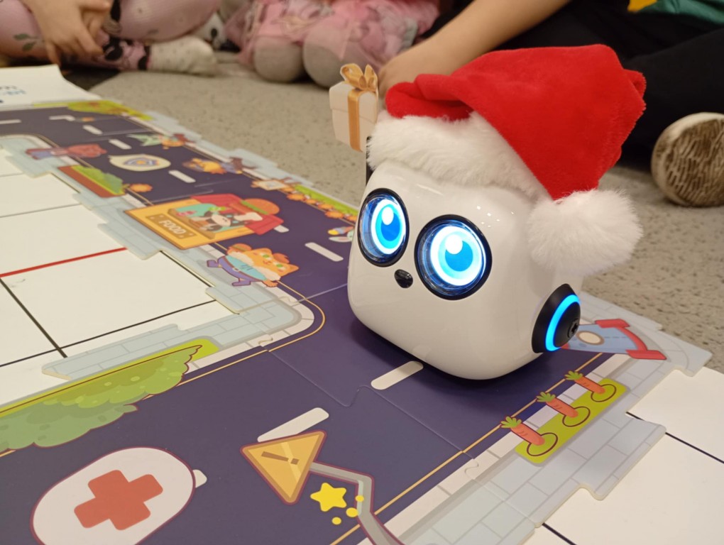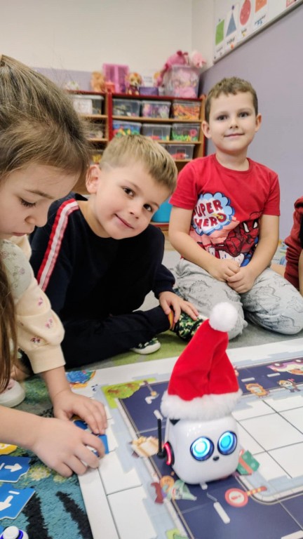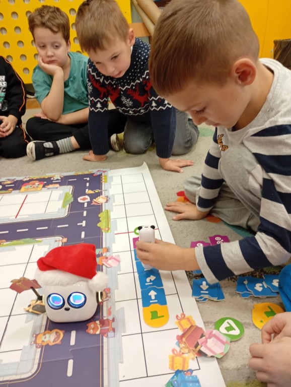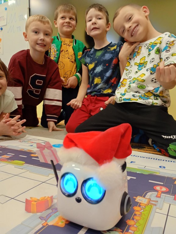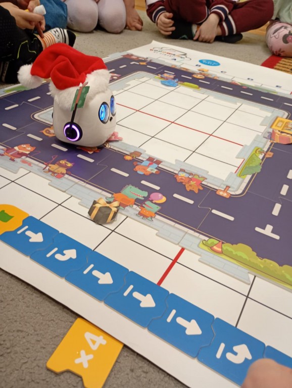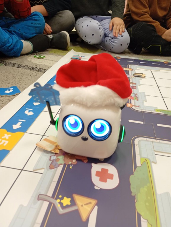 Podczas zajęć dzieci poznały nowego robota interaktywnego mTiny i uczyły się podstaw programowania poprzez świąteczną zabawę. Robot mTiny wcielił się w Mikołaja, który potrzebuje pomocy w przygotowaniach do świąt. Dzieci najpierw ułożyły mapę z puzzli, następnie korzystając z kart-kodów oraz kontrolera, zaplanowały trasę robota tak, aby Mikołaj mTiny dotarł do wszystkich dzieci. Zajęcia łączyły naukę z zabawą, a jednocześnie wprowadziły dzieci w świąteczny, radosny nastrój.