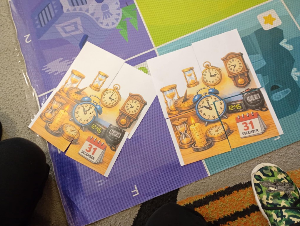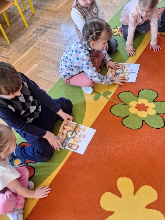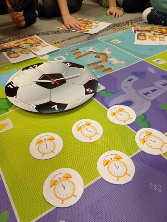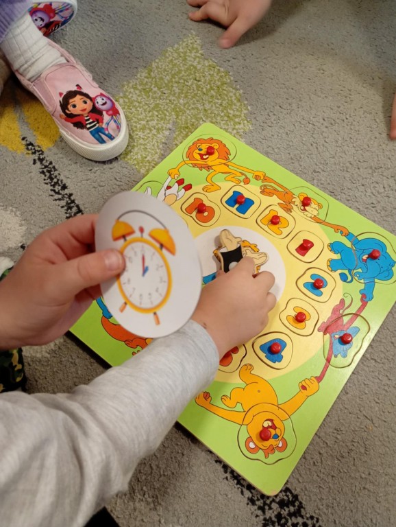 Zajęcia rozpoczeliśmy od układania puzzli, które wprowadziły dzieci w temat czasu. Na podstawie obrazków odbyła się rozmowa nt. różnych rodzajów zegarów. Dzieci poznali zegar analogowy i cyfrowy, wskazywali różnice oraz opowiadali, do czego służy zegar i dlaczego czas jest ważny w codziennym życiu. Przedszkolaki uczyły się odczytywania czasu na zegarze. Poznały pojęcia: godzina, minuta, pełna godzina, a także ćwiczyły ustawianiem wskazówek na zegarze zgodnie z podanym czasem.