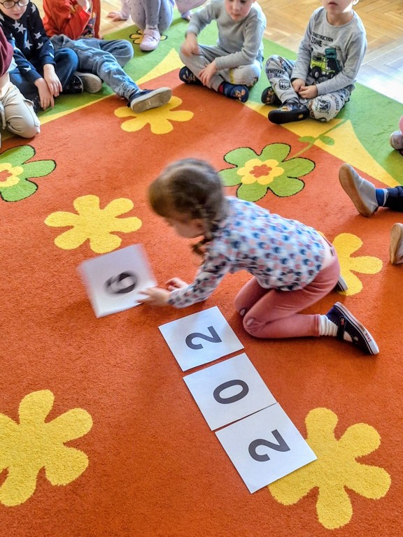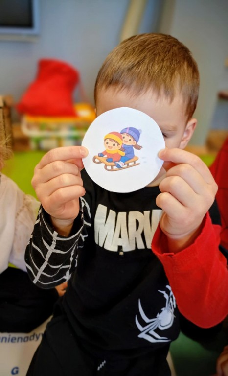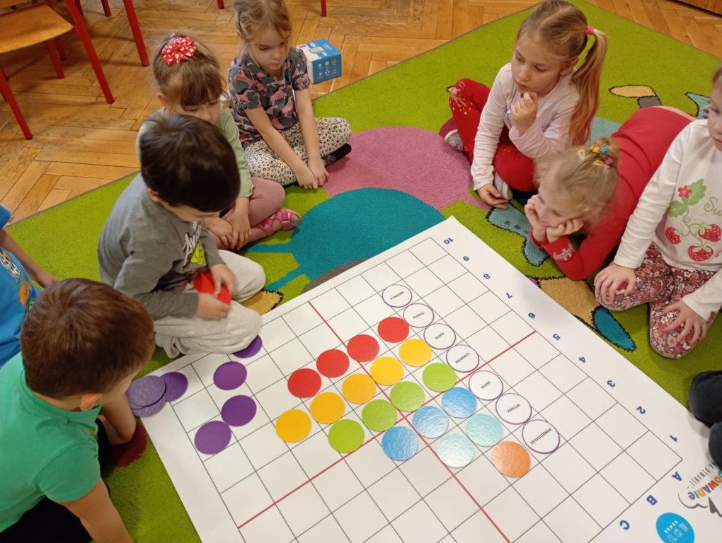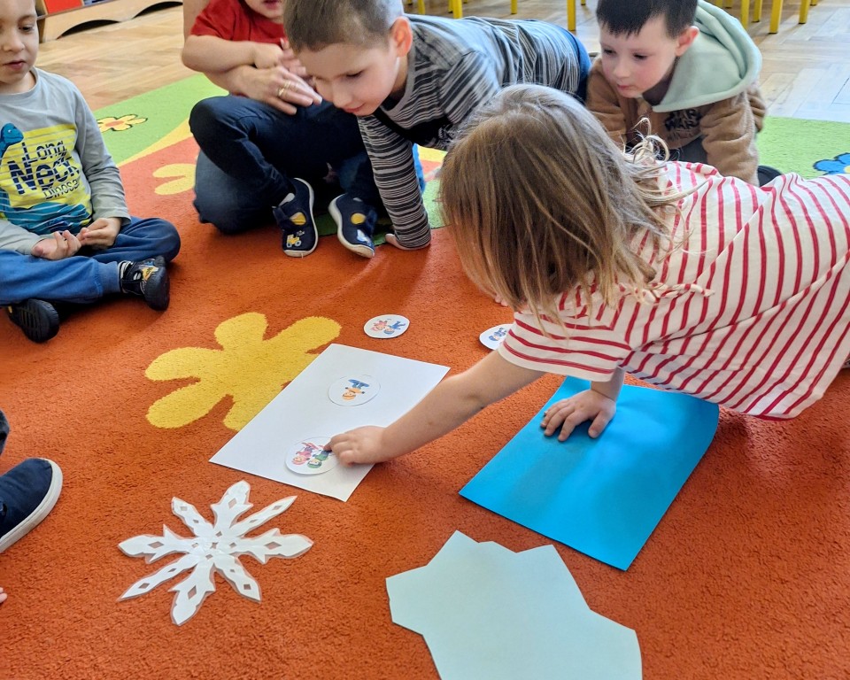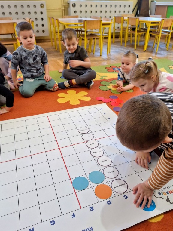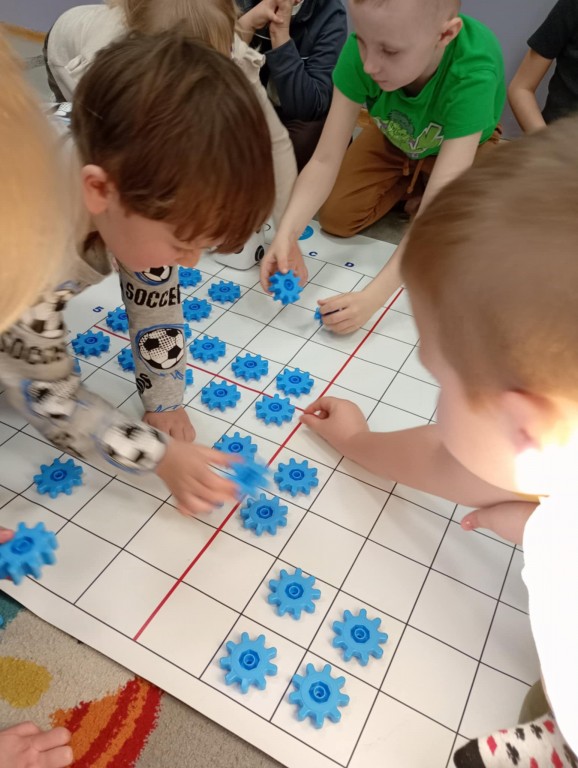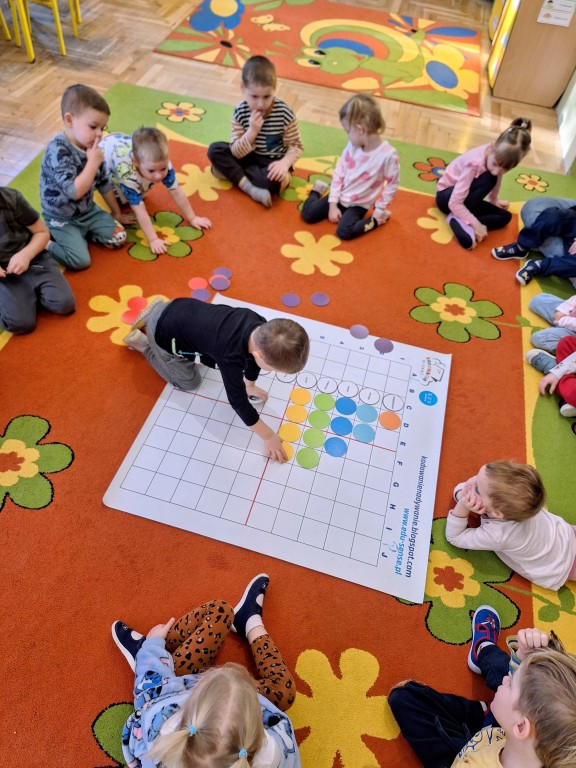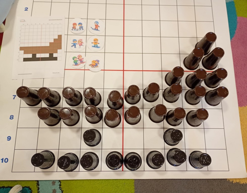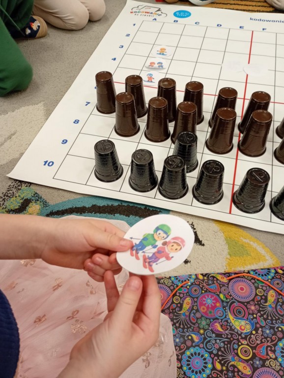 Podczas zajęć z kodowania i programowania dzieci uczestniczyły w rozmowie kierowanej na temat sportów zimowych. Wspólnie wymieniały znane dyscypliny oraz omawiały zasady bezpieczeństwa obowiązujące podczas zimowych aktywności. Następnie przedszkolaki układały obrazek z kubków według podanego wzoru czy koordynatów, ćwicząc orientację przestrzenną, spostrzegawczość oraz odwzorowywanie schematów.