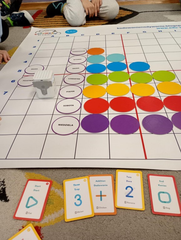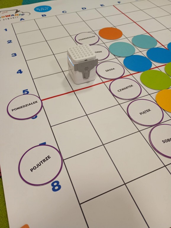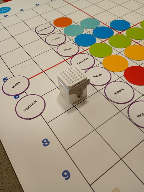 Na zajęciach wykorzystaliśmy karty matematyczne do programowania robiota GeniBota. Utrwaliliśmy w ten sposób nie tylko tematykę związaną z cyklicznością dni tygodnia, dodatkowo poćwiczyliśmy umiejętność dodawania i odejmowania.